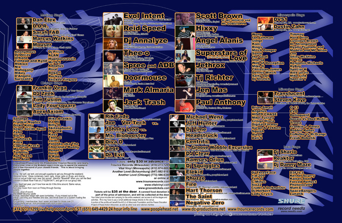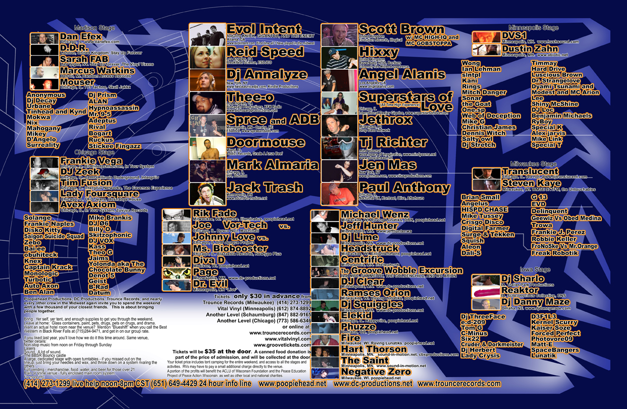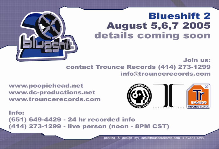 with: Blueshift 2 August 5, 6, 7 Black River Falls, WI infolines: 651-649-4429 :: 414-273-1299 www.dc-productions.net - www.poopiehead.net DC Productions and Trounce Records are very happy to bring you... ![]() August 5,6,7 - Black River Falls, WI |