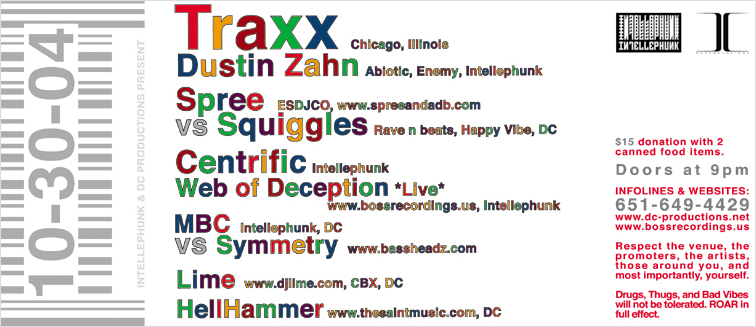 | Traxx Chicago, IL Kode, Gigolo, Spectral Spree ESDJCO, www.spreeandadb.com vs Squiggles Rave N Beats, Happy Vibe, DC Web of Deception *Live* www.bossrecordings.us Intellephunk Lime www.djlime.com CBX - DC |